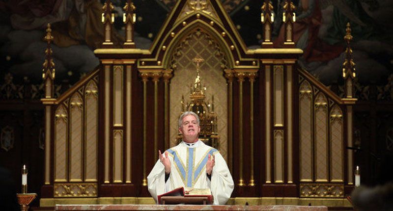 Rev. Warren Hall claims he was fired as director of campus ministry at Seton Hall University over a pro-LGBT social media post. Here, Hall leads a special mass for couples renewing their vows on Valentine’s Day 2014 at the Chapel of the Immaculate Conception on the university's South Orange campus. (Frances Micklow/The Star-Ledger)