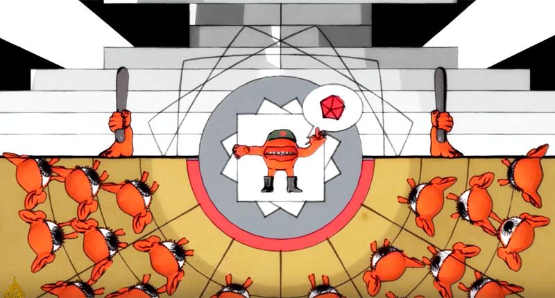 "Propaganda," Goodman begins in her narration of the cartoon. "Many use the word when talking about countries like North Korea, Kazakhstan, Iran, Countries viewed as authoritarian through the lens of the western media. 'Press freedom'. 'Freedom of thought'. People use those terms when talking about countries like the United States, France, Australia. 'Democracies'."