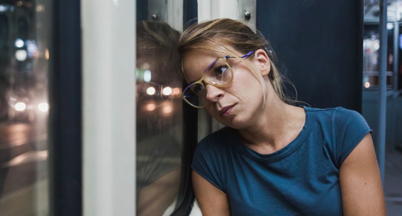 A woman stares into the distance while riding a bus. Image via Shutterstock.