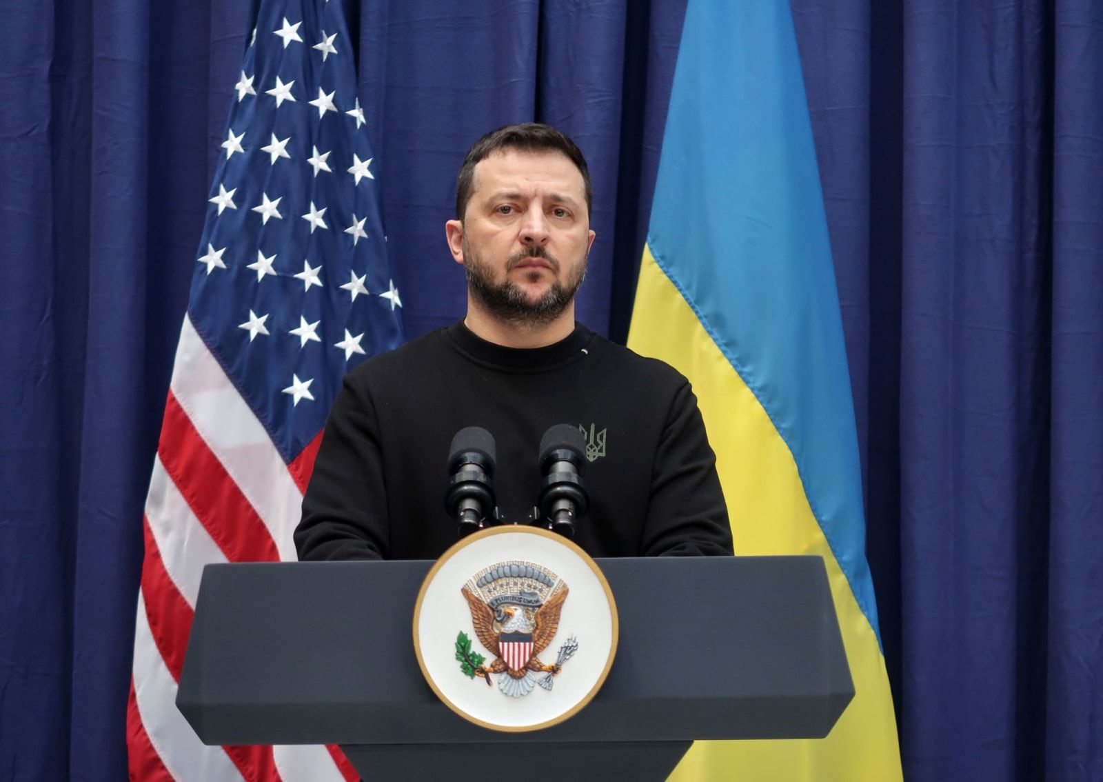 Ukrainian President Volodymyr Zelensky speaks during a press conference with US Vice President Kamala Harris after their meeting on the sidelines of the 60th Munich Security Conference (MSC). -/Ukrinform/dpa