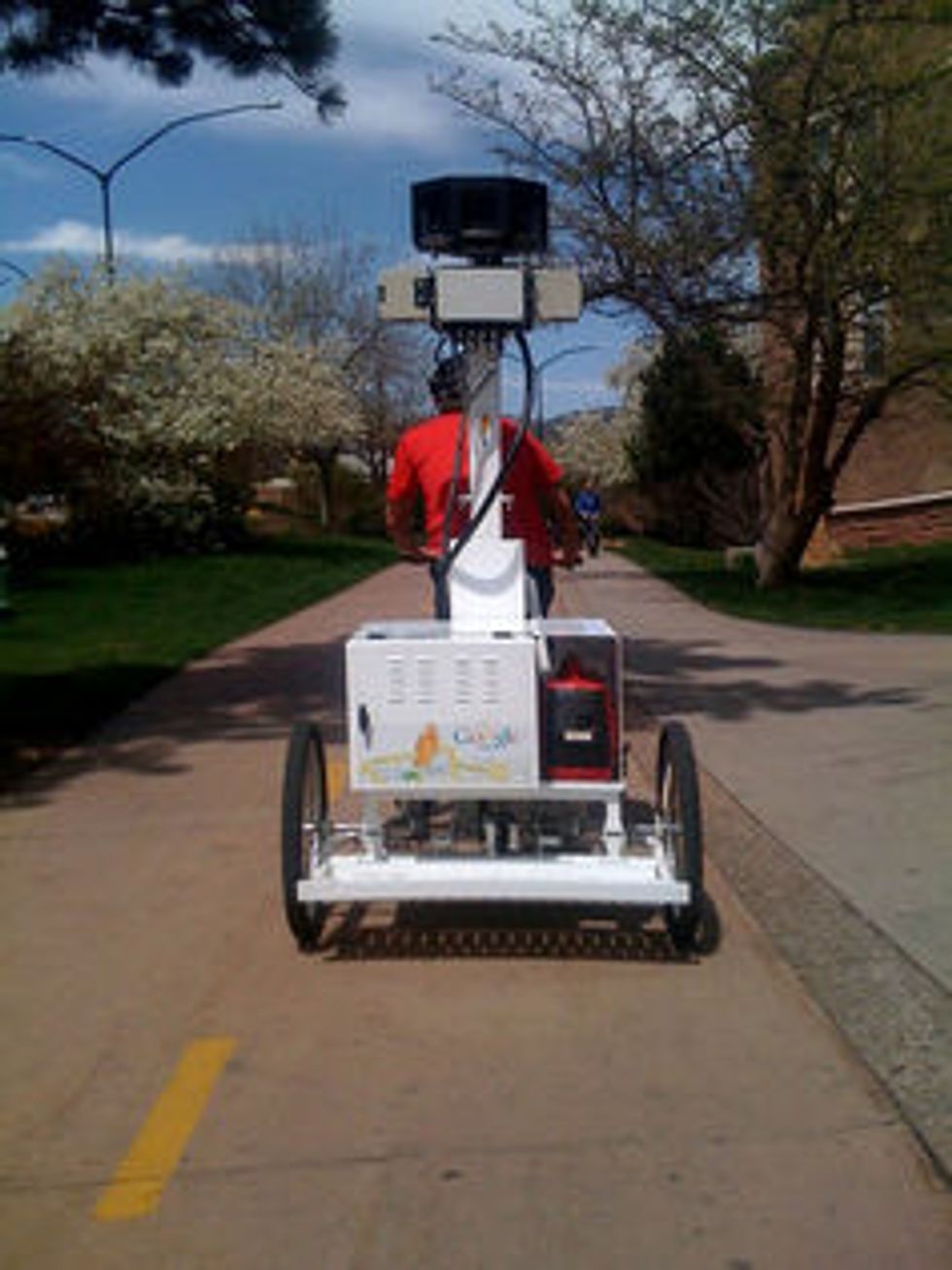 Users have participated in Google’s mapping efforts. Here, a bicycle has been outfitted with Google’s sophisticated Street View camera to map a bike path.