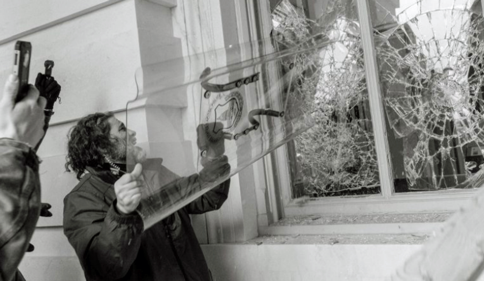 The rioters displayed remarkable coordination, with Morss taking a prominent role. As described in affidavit supporting charges, a YouTube video shows Morss and other rioters rip a riot shield away from a Metropolitan police officer. Morss or another rioter — it's not clear from the video — yelled, "Send the shield back, send the shield back!" Minutes later, Morss reportedly carried the shield away and passed it to the rioters behind him, who in in turn passed further back into the crowd.
