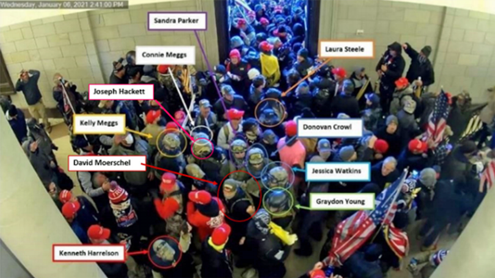 Alleged Oath Keepers storming the U.S. Capitol during insurrection.( Department of Justice screengrab)