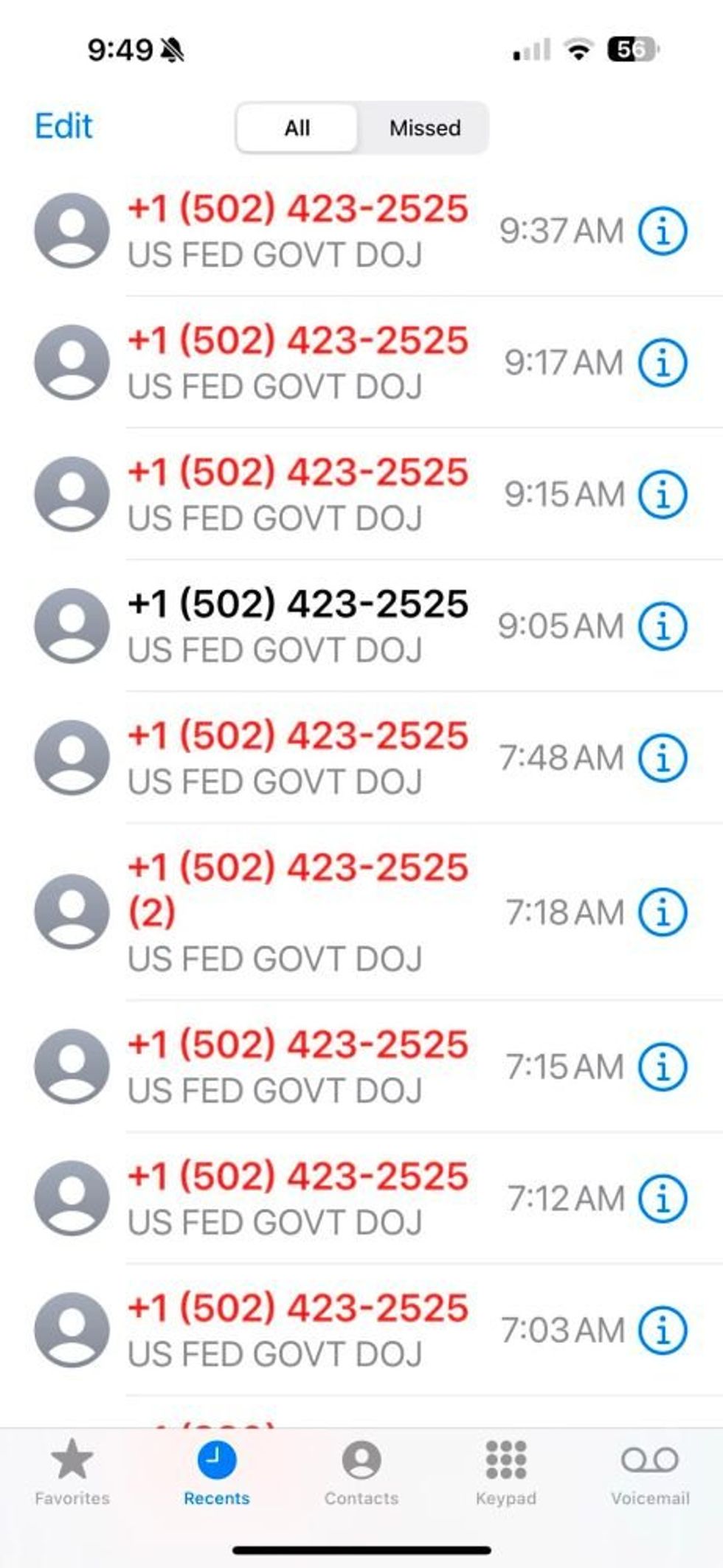 Sergeant Gonell @sergeantaqgo.bsky.social sent me this picture. This is his call log. Each call is an automated Dept of "Justice" notification saying "The defendant you testified against is being released from the dept of corrections." Each defendant assaulted him.