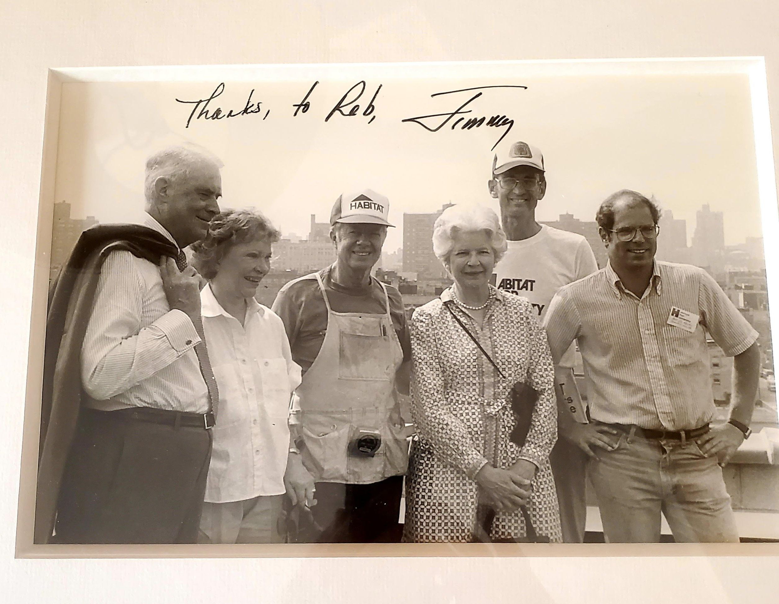 A framed photo print signed by former President Jimmy Carter (left center) and addressed to author Rob DeRocker. Carter and DeRocker are pictured working on a Habitat for Humanity project in New York City during July 1985. Rob DeRocker/courtesy