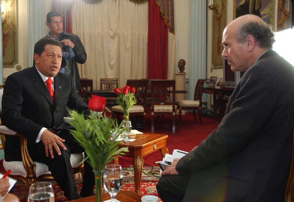 Greg Palast interviews Hugo Chavez. Picture: Richard Rowley for BBC-TV (c)2004 the Palast Investigative Fund.