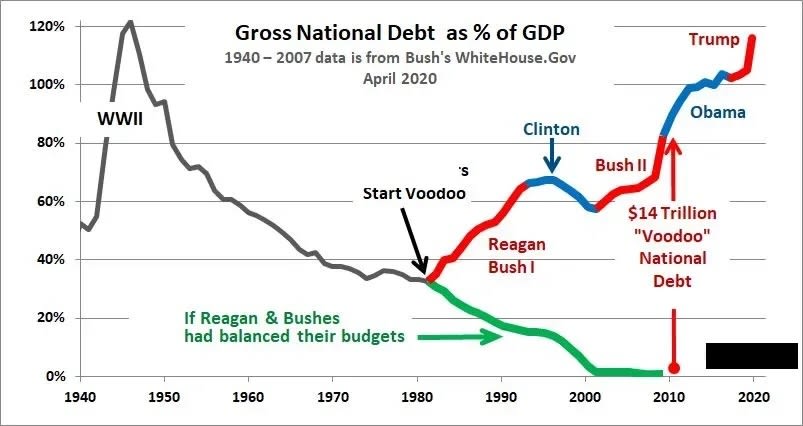 They called it their “Two Santas” strategy, which I detail here, and over the course of the Reagan, Bush, and Trump tax cuts and two illegal wars, four Republican presidents managed to add over $37 trillion to our national debt.