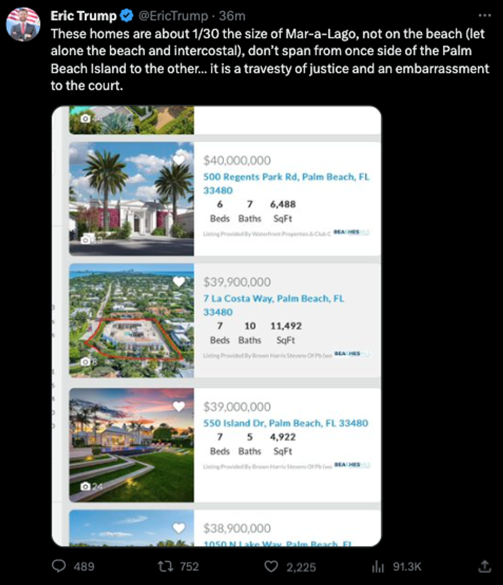 To prove his point, the younger Trump posted real estate listings of Palm Beach homes that total under $40 million.
