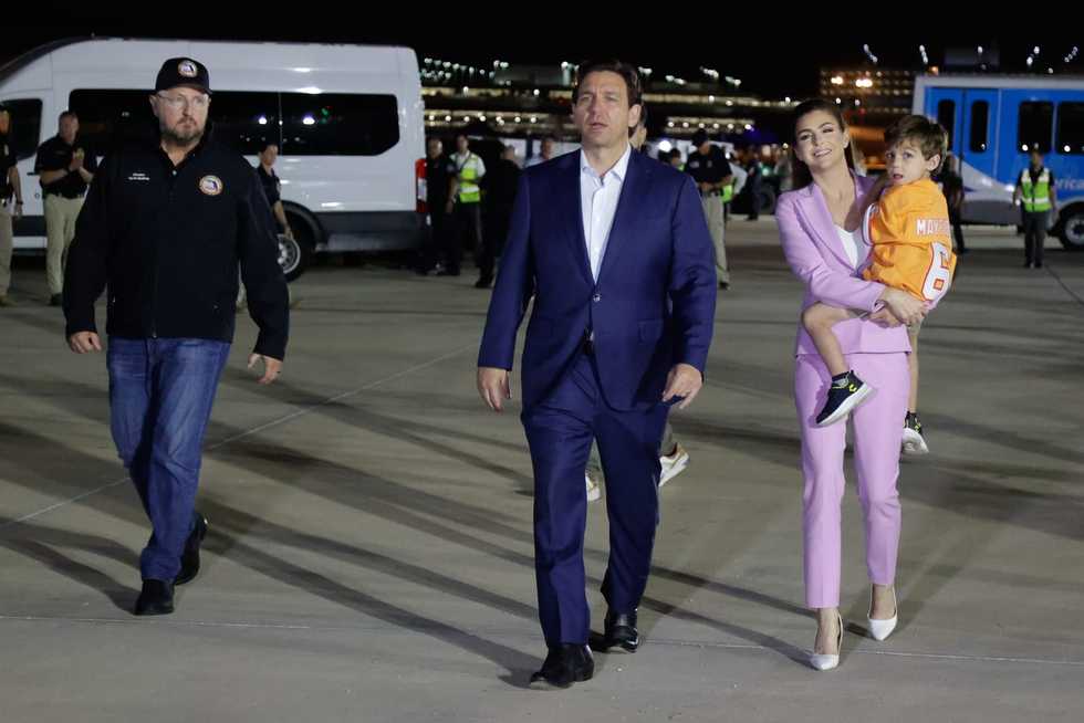 Ron DeSantis greeted passengers arriving from Israel on a chartered flight organized by Project Dynamo on Sunday, Oct. 15, 2023, in Tampa. - Luis Santana/Tampa Bay Times/TNS