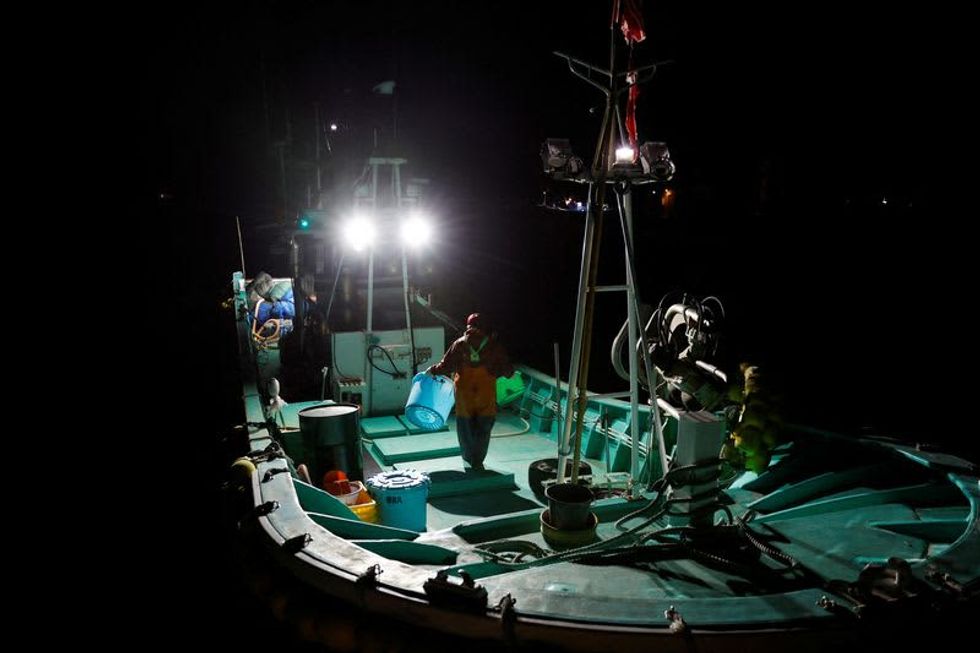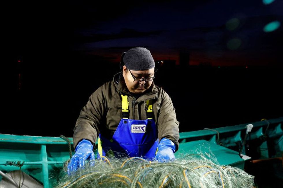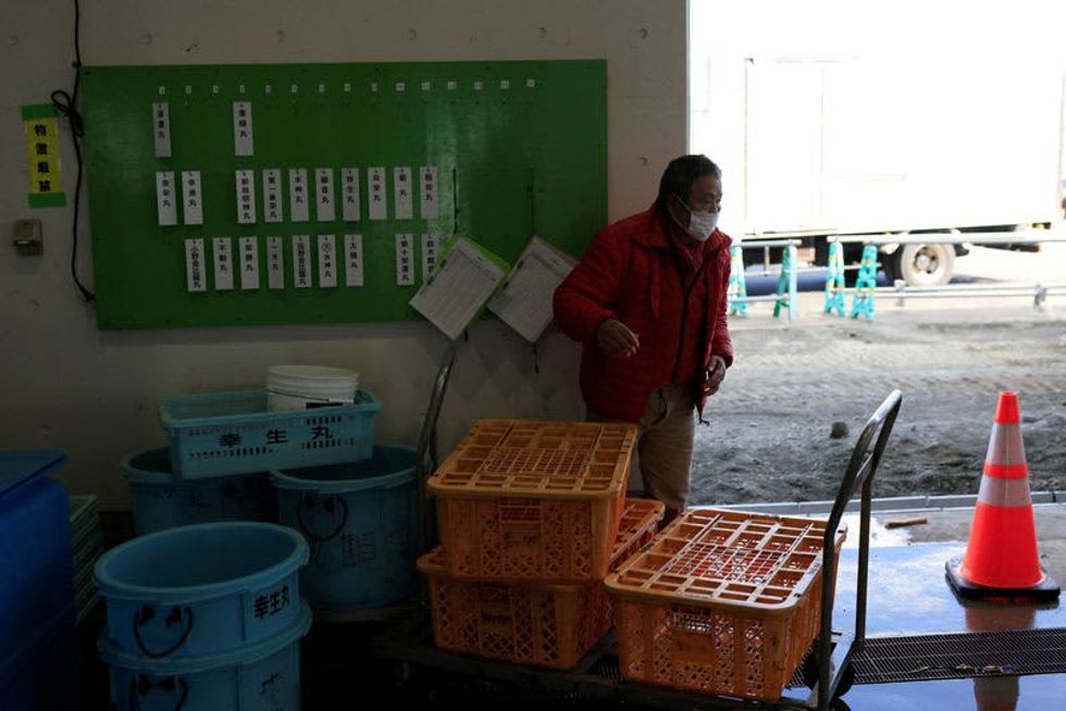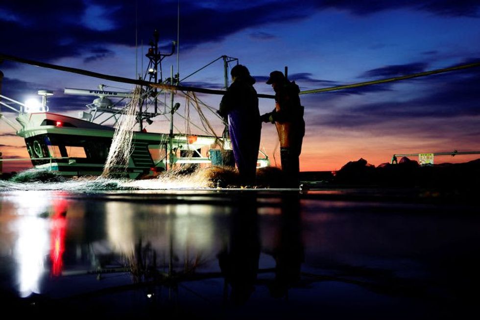 SHINCHIMACHI, Japan (Reuters) - A chilly dawn paints the sky magenta and purple as Japanese fisherman Haruo Ono unloads his catch of flounder, crab and sea bass from his boat at the small port of Shinchimachi.