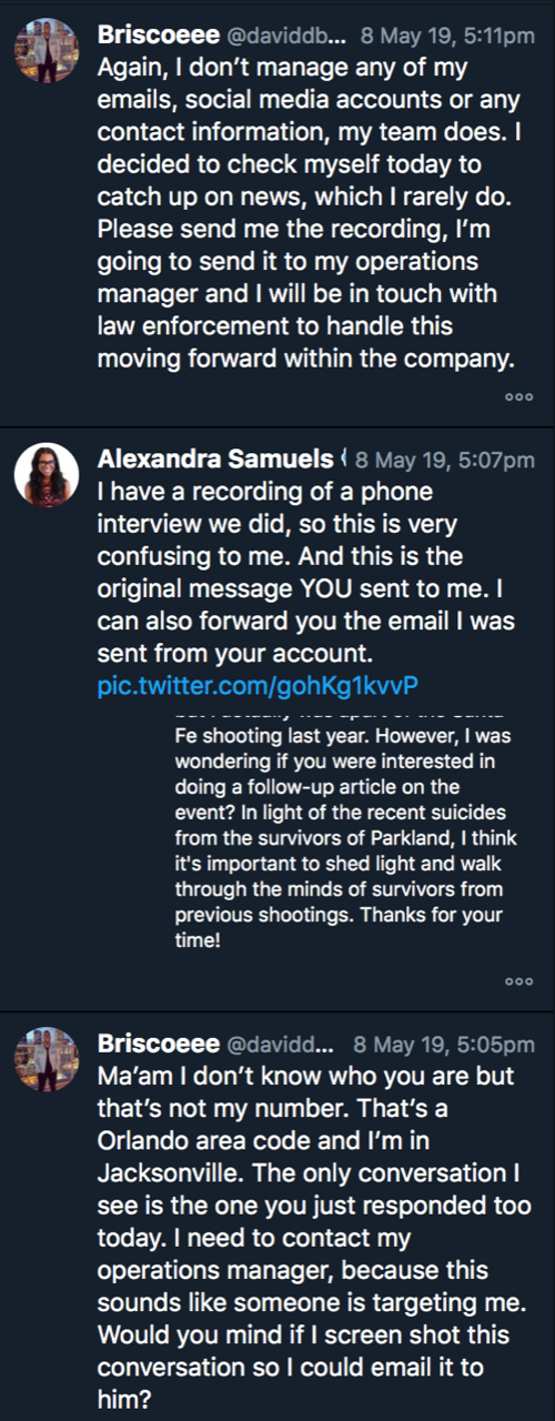 After the initial April 25 phone interview with the Tribune, the man calling himself David Briscoe went quiet until mid-May, when he responded to a direct message on Twitter.