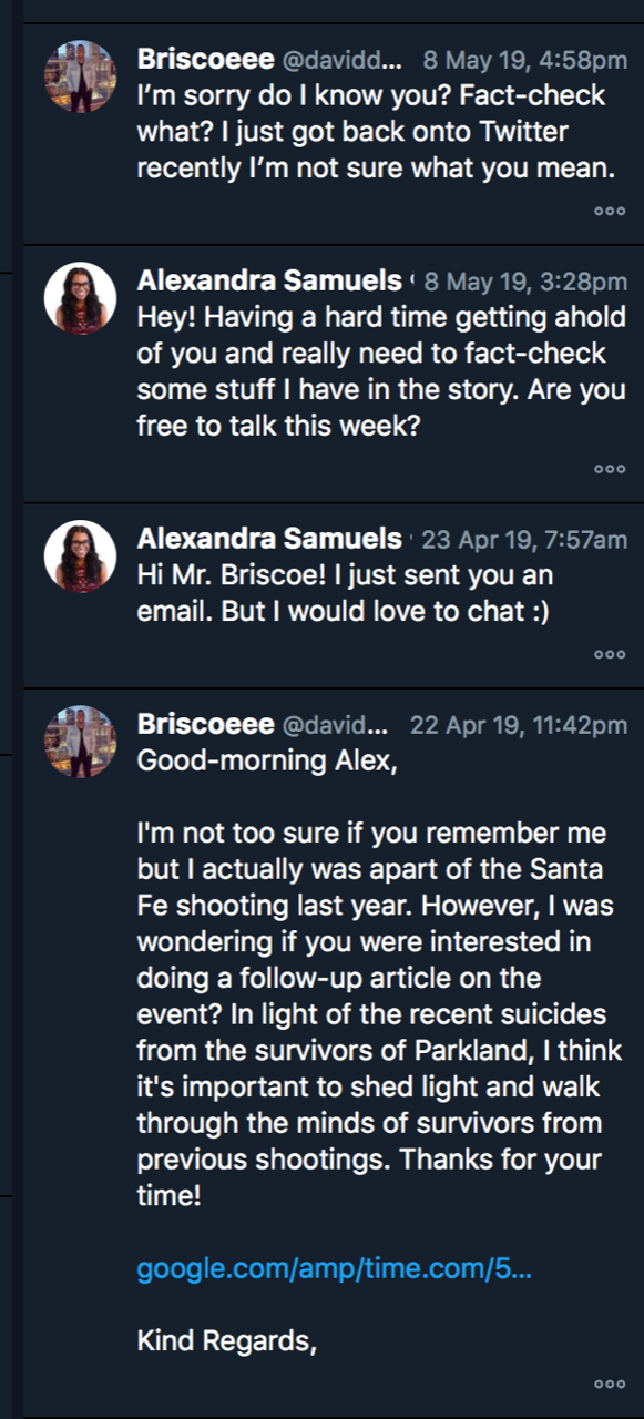 The man using Twitter handle @daviddbriscoe reached out to the Tribune in April, hoping to discuss his role as a survivor of the Texas tragedy as news reports circulated of survivors of a school shooting at Marjory Stoneman Douglas High School in Parkland, Fla. taking their own lives.