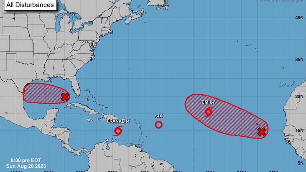 Tropical storms Franklin and Emily— along with five other disturbances— were being monitored in the Atlantic Ocean on Sunday, Aug. 20, 2023. - National Hurricane Center/National Hurricane Center/TNS
