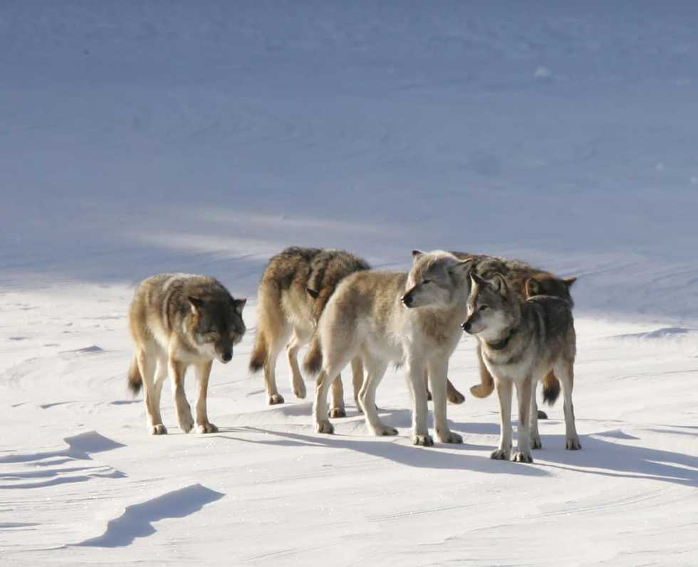 The wolf M93, nicknamed 'Old Gray Guy' by researchers, stands out amid other pack members with his distinctive lighter color