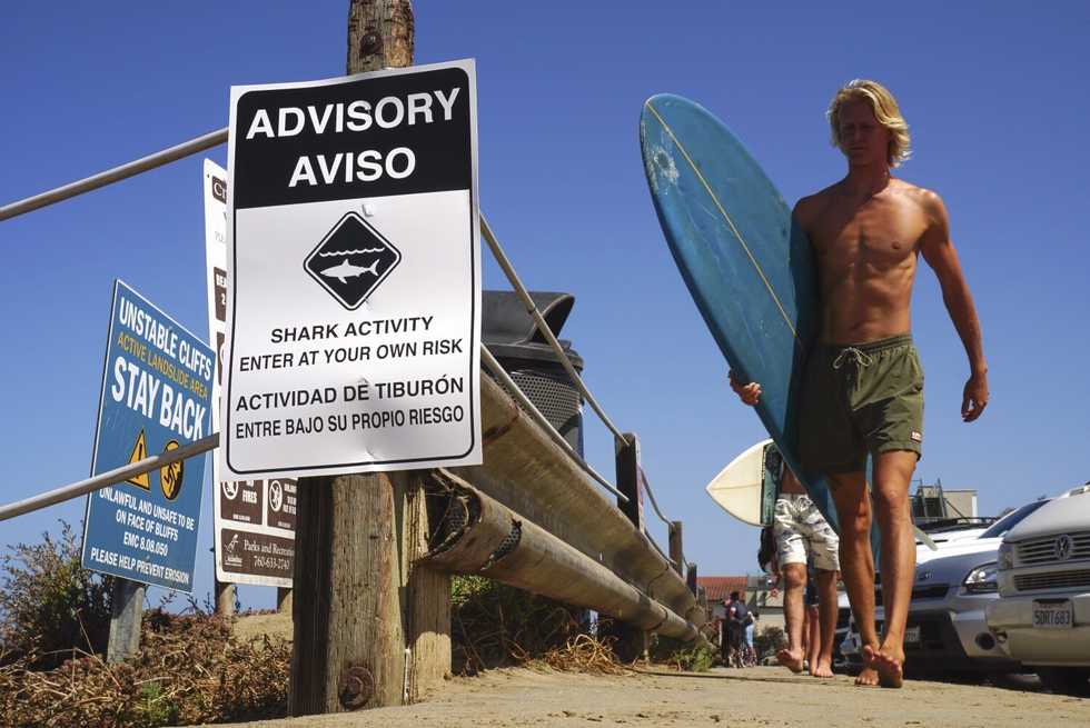 A sign warning beachgoers about shark activity is posted at the top of the trail leading down to Beacon's Beach in Leucadia in 2019 in Encinitas, California. - Hayne Palmour IV/Los Angeles Times/Hayne Palmour IV/San Diego Union-Tribune