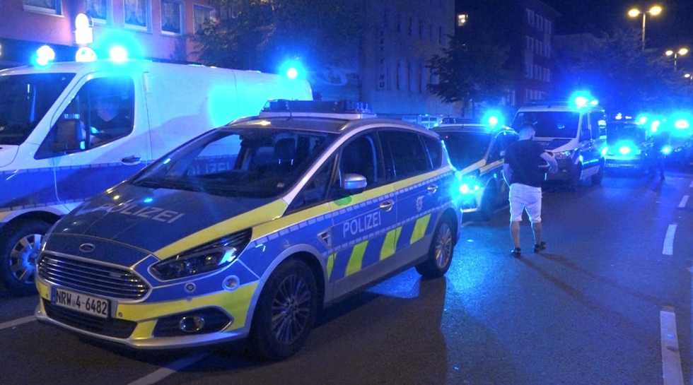Police vehicles stand in the city center during an operation. A mass brawl involving around 80 people that broke out on Friday evening in the western German city of Essen left several people injured, including two police officers. Markus Gayk/dpa