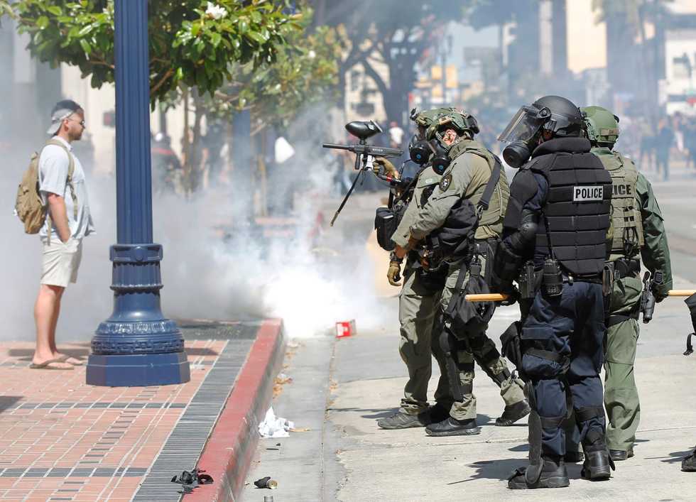 In this May 31, 2020, file photo, San Diego police officers fire rubber bullets, tear gas and flash-bangs at protesters near the San Diego Hall of Justice. - K.C. Alfred/The San Diego Union-Tribune/TNS