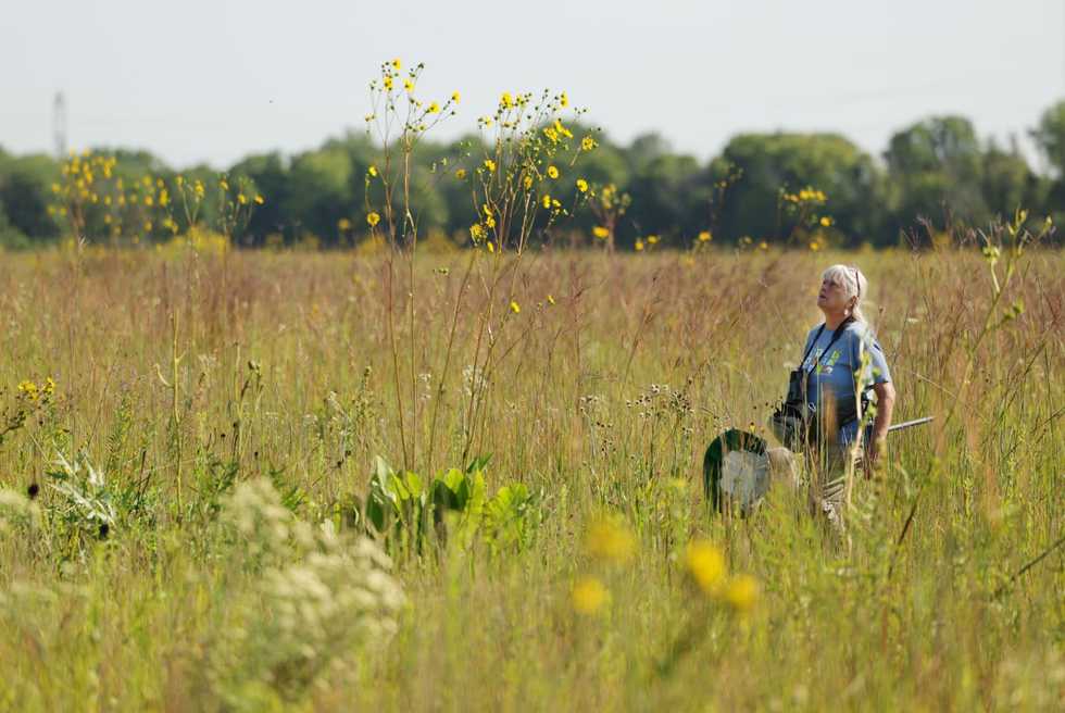 Barbara Williams carries an insect net and looks for bees, dragonflies and other insects in Deer Run Forest Preserve on Aug. 16, 2023, in Cherry Valley, Illinois. - Stacey Wescott/Chicago Tribune/TNS