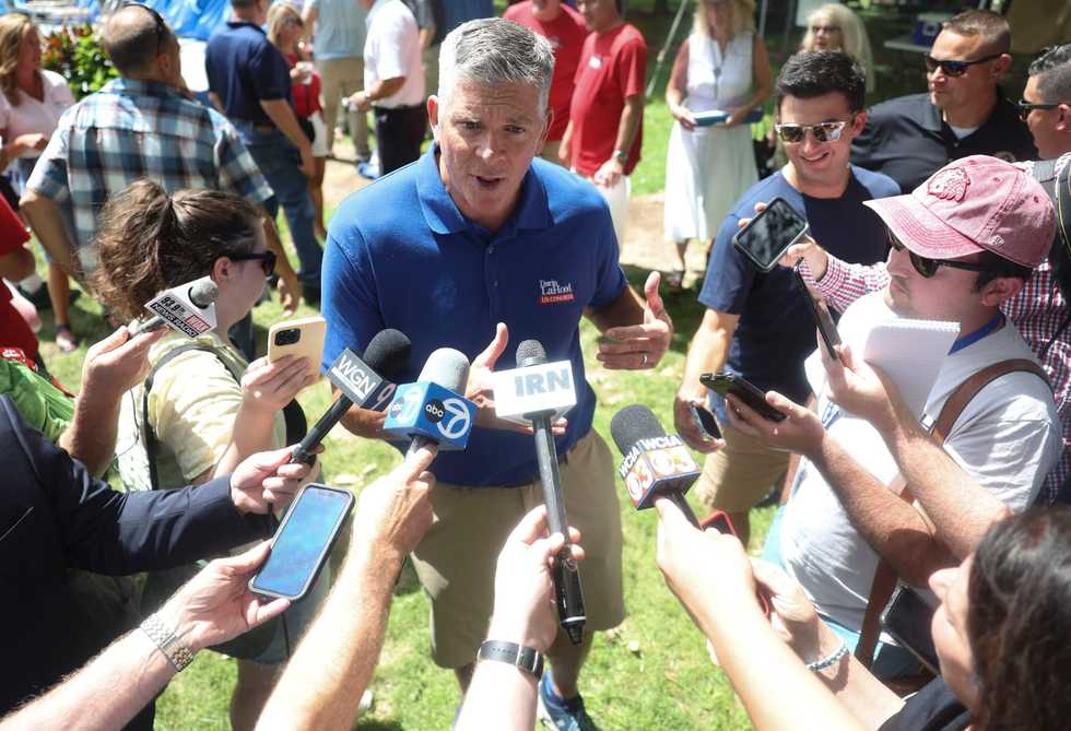 Darin LaHood speaks to reporters during Republican Day at the Illinois State Fair on Thursday, Aug. 17, 2023, in Springfield, Illinois. - Trent Sprague/Chicago Tribune/TNS