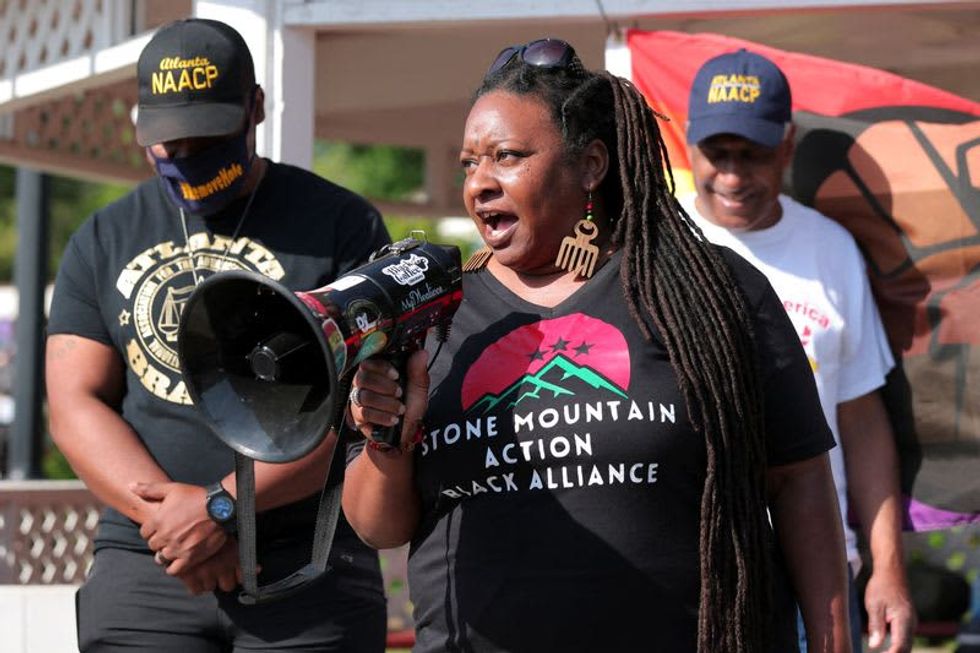 Carrying signs decrying "racist traitors," about a hundred civil rights activists marched and chanted at Georgia's Stone Mountain on Saturday to protest at the return of an annual celebration of the Confederacy.