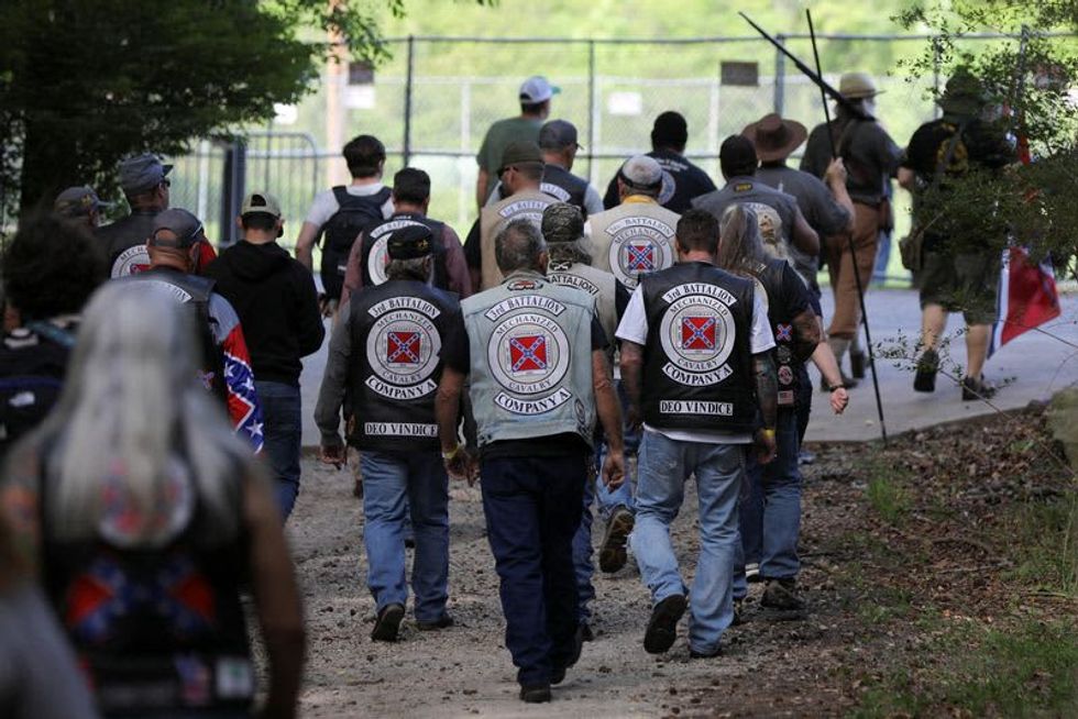 The protest took place at the foot of a towering monument to the heroes of the South's pro-slavery past, as 200 supporters of the state chapter of the Sons of Confederate Veterans (SCV)gathered for its celebration, which it says honors the sacrifices of their forebears.
