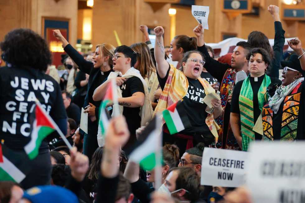 Elya Piazza is pictured here with glasses and short hair, protesting for a ceasefire in the Israeli-Hamas conflict at 30th Street Station alongside hundreds of young Jews and others. - Charles Fox/The Philadelphia Inquirer/TNS