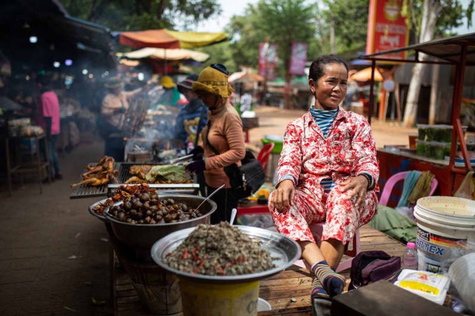 Oudongk market, located around one hour north of central Phnom Penh, is not your usual throng of food vendors. Alongside grilled chicken and banana pancakes, visitors can also find cooked silkworms, crispy fried crickets, vast piles of red ants complete with bone-white eggs, and mounds of fried tarantulas.