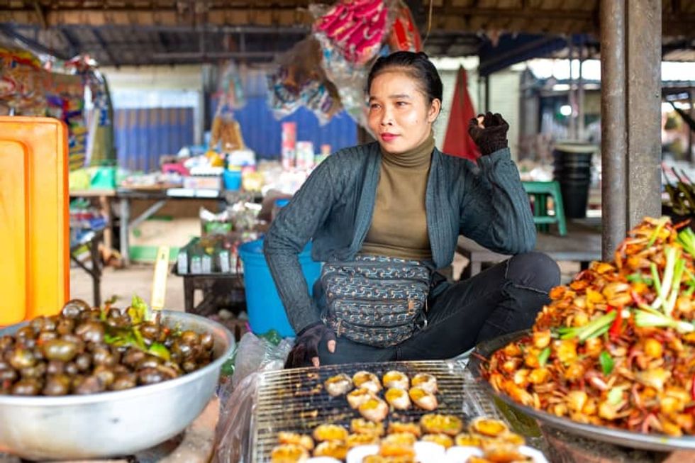 In Kampong Thom province, about two hours north of Oudongk market, spider-catchers dig holes and use wooden sticks to snag the tarantulas, which they can catch and defang in just 30 seconds. Cricket trappers, meanwhile, can catch about 90 crickets a night, before selling them to brokers.