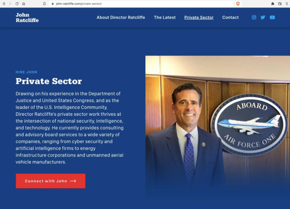 Forbes showed a screen capture (below) of Ratcliffe's personal website showing his "private sector" experience and promoting his latest appearances on the Fox network as a former Trump official. There's nothing on the site to indicate it's paid for by the campaign, nor does it ask for campaign donations or cite a district.