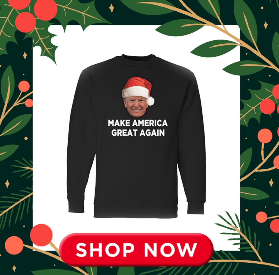 Other Christmas merchandise includes a golden MAGA baseball cap ornament, mugs, T-shirts and crewneck shirts with cutouts of Trump donning a Santa hat, and a green MAGA baseball with red writing.