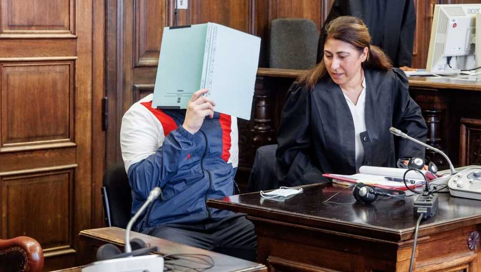 A defendant hides his face behind a file folder at the beginning of the trial. The man allegedly attacked his wheelchair-bound grandmother with a hatchet and killed her with blows to her head and neck area. Markus Scholz/dpa