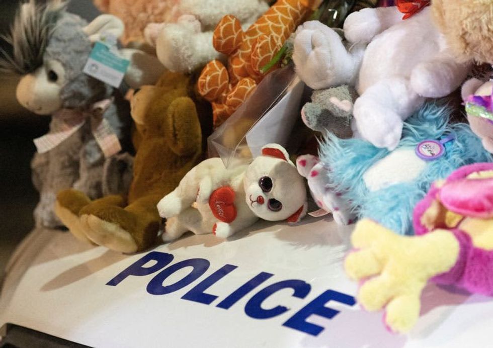 At one point, a Laval police cruiser parked on the crime scene perimeter was piled high with stuffed toys, flowers and sympathy messages. More lie by a nearby fence and outside a local church where people stopped last evening to leave plush animals and candles as well to console each other.