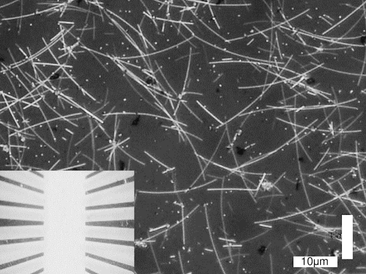 Our research focuses on a system that uses a network of “nanowires” to mimic the neurons and synapses in the brain. These nanowires are tiny wires about one thousandth the width of a human hair. They are made of a highly conductive metal, such as silver, typically coated in an insulating material like plastic.