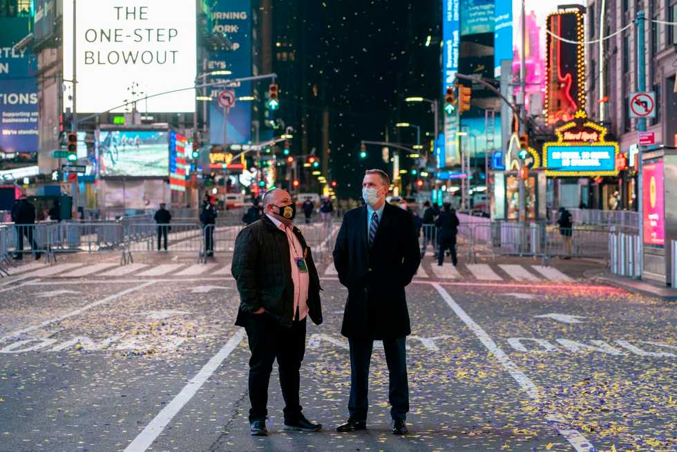 New York City Police Commissioner Dermot Shea at right, is on hand in a nearly empty Times Square before midnight's celebration of the new year in New York City on December 31, 2020. - COREY SIPKIN/AFP/AFP/TNS