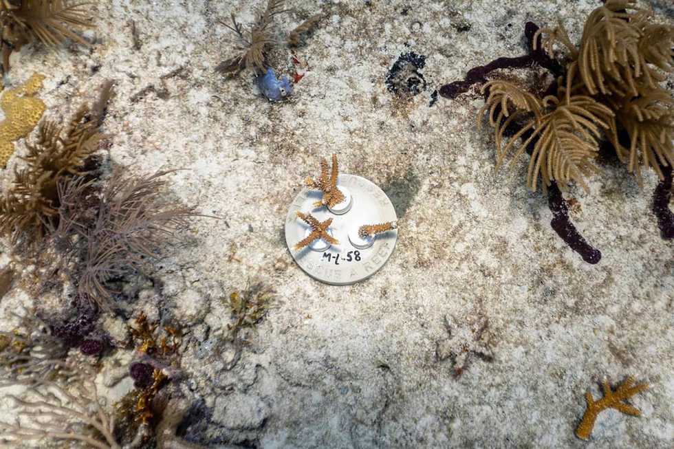 A cement base holds coral fragments planted at Paradise Reef during a Rescue A Reef coral restoration dive off the coast of Key Biscayne, Florida, on Aug. 4, 2023. - D.A. Varela/Miami Herald/TNS
