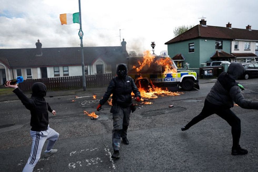 A Reuters photograph showed four young people in the mainly Irish nationalist area of Creggan throwing petrol bombs at an armoured police vehicle, which was covered in flames on one side.