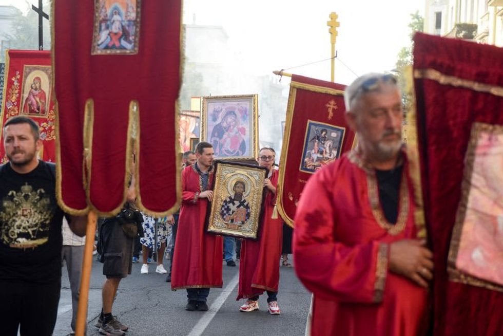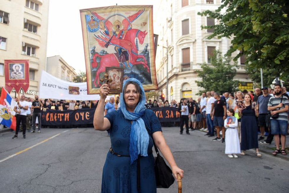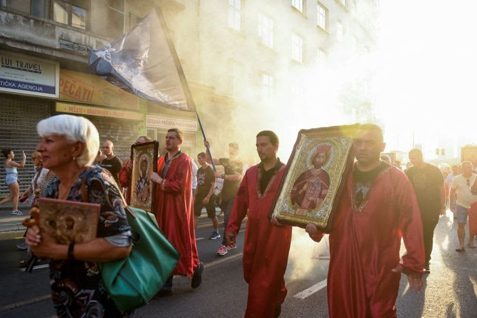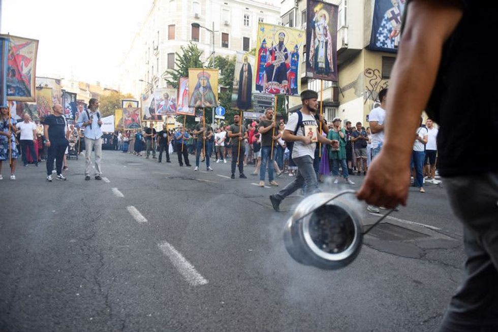 Sunday's protest against the EuroPride event, held during a procession to mark a religious holiday, was led by clergy from the Serbian Orthodox Church, some of whose bishops say the Pride event threatens traditional family values and should be banned.