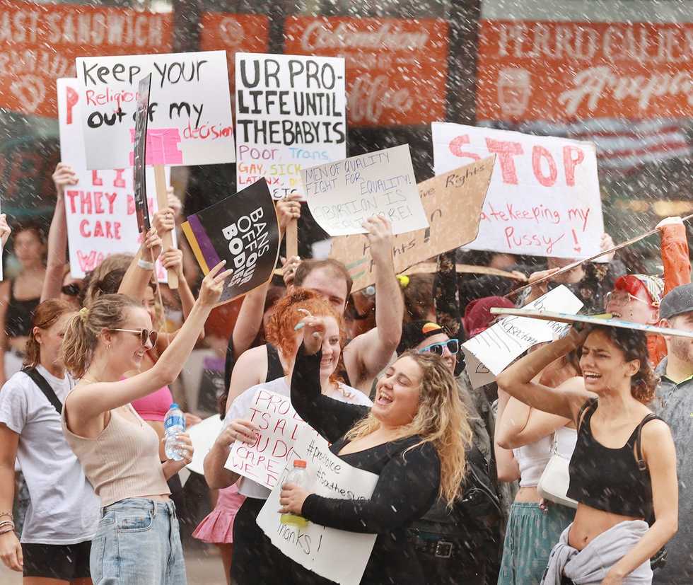 Demonstrators chant and hold signs in the rain during an abortion rights rally in downtown Orlando, Florida, on June 27, 2022. - Stephen M. Dowell/Orlando Sentinel/TNS