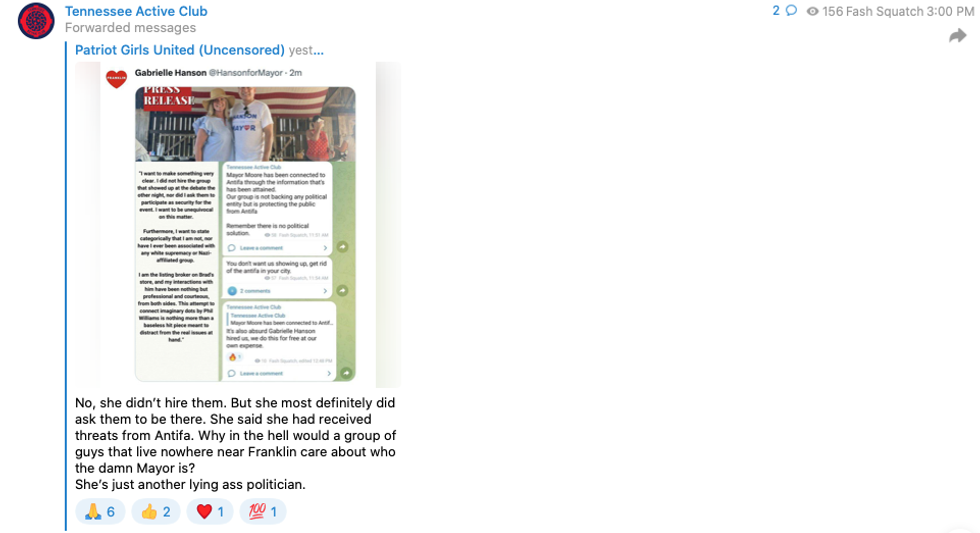 “No, she didn’t hire them. But she most definitely did ask them to be there,” the Patriot Girls United (Uncensored) channel posted, alongside a screengrab of Hanson’s press release. “She said she had received threats from Antifa. Why in the hell would a group of guys that live nowhere near Franklin care about who the damn mayor is?