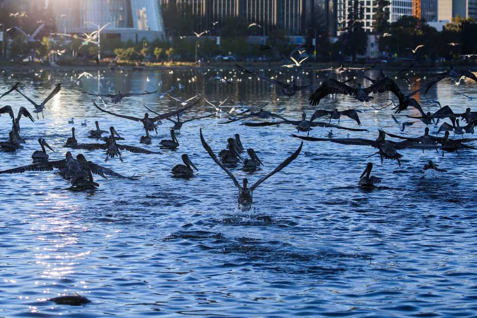 Pelicans take flight as they eat live fish near the thousands of dead fish floating around Lake Merritt in Oakland, California on Aug. 31, 2022. - Ray Chavez/Bay Area News Group/TNS