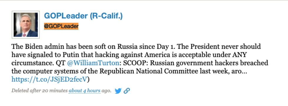 Huffington Post reporter Jennifer Bendery noticed Tuesday that Republican House Minority Leader Kevin McCarthy (R-CA) has deleted a tweet that criticized President Joe Biden for being "soft" on Russia and Vladimir Putin.