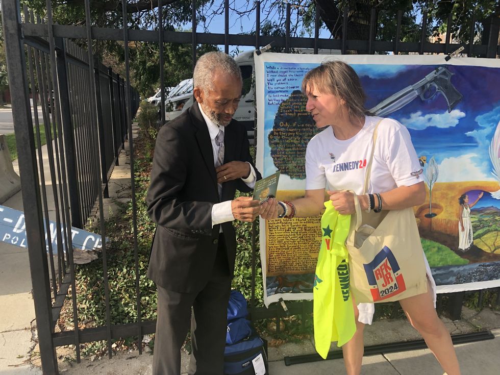 Vanessa Eggert passes out a flyer in support of Robert F. Kennedy Jr. near the United Center (Photo by Alexandria Jacobson/Raw Story)