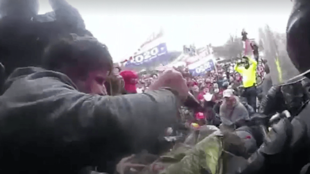 Body camera video shows Capitol insurgents trampling a woman who carried a Gadsden flag to a march supporting former president Donald Trump's bid to remain in office despite his election loss.