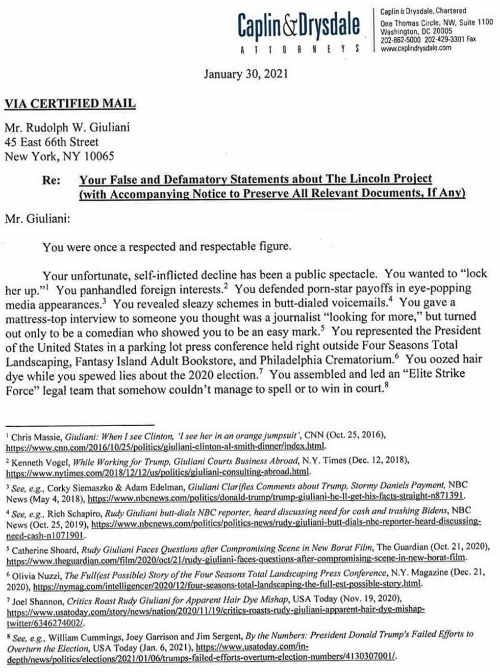 Former New York City Mayor Rudy was put on notice that he must retract his allegations that the Lincoln Project was responsible for organizing the fatal January 6th insurrection at the U.S. Capitol.