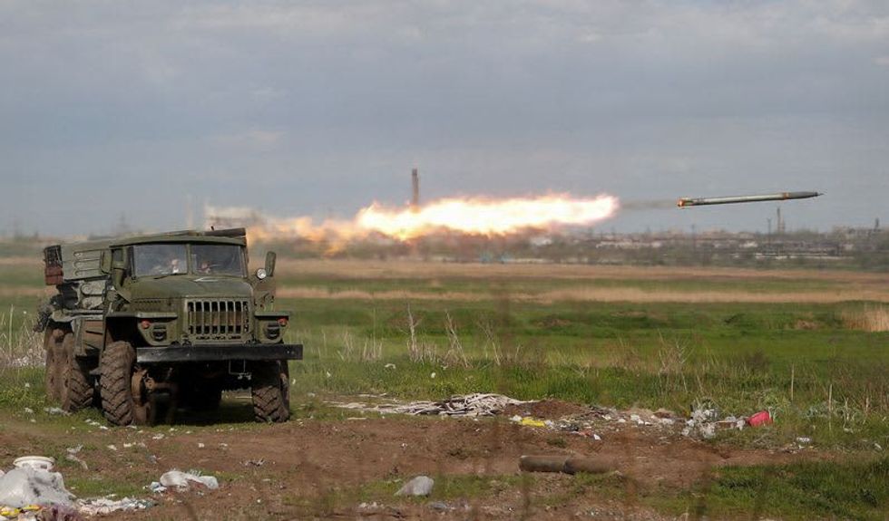 Reuters images showed volleys of rockets fired from a Russian truck-mounted launcher towards the sprawling Soviet-era steel complex from the outskirts of Russian-occupied Mariupol on Monday.