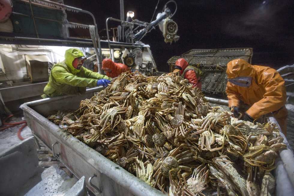 Deckhands aboard the crab boat Arctic Hunter in the Bering Sea off Alaska separate male and female snow crab on March 21, 2013. - Steve Ringman/The Seattle Times/TNS