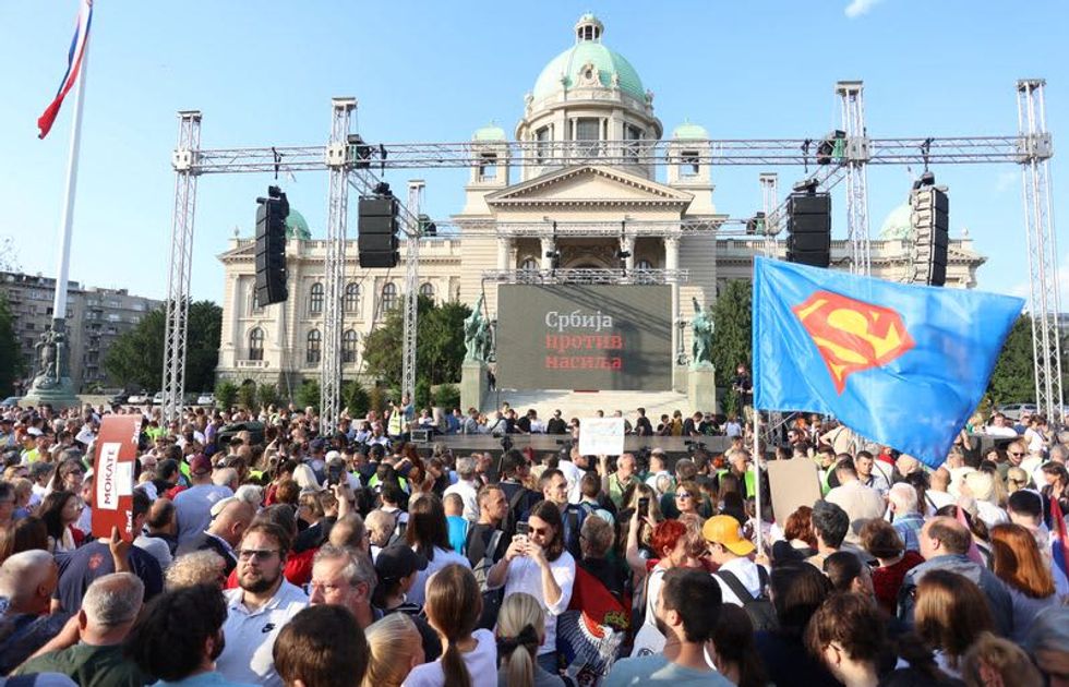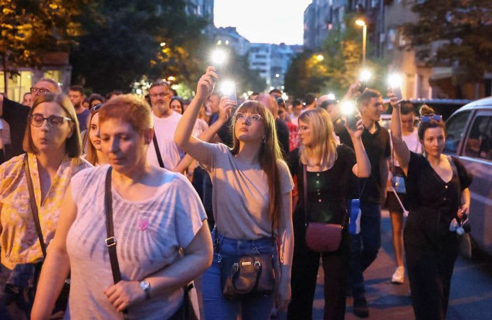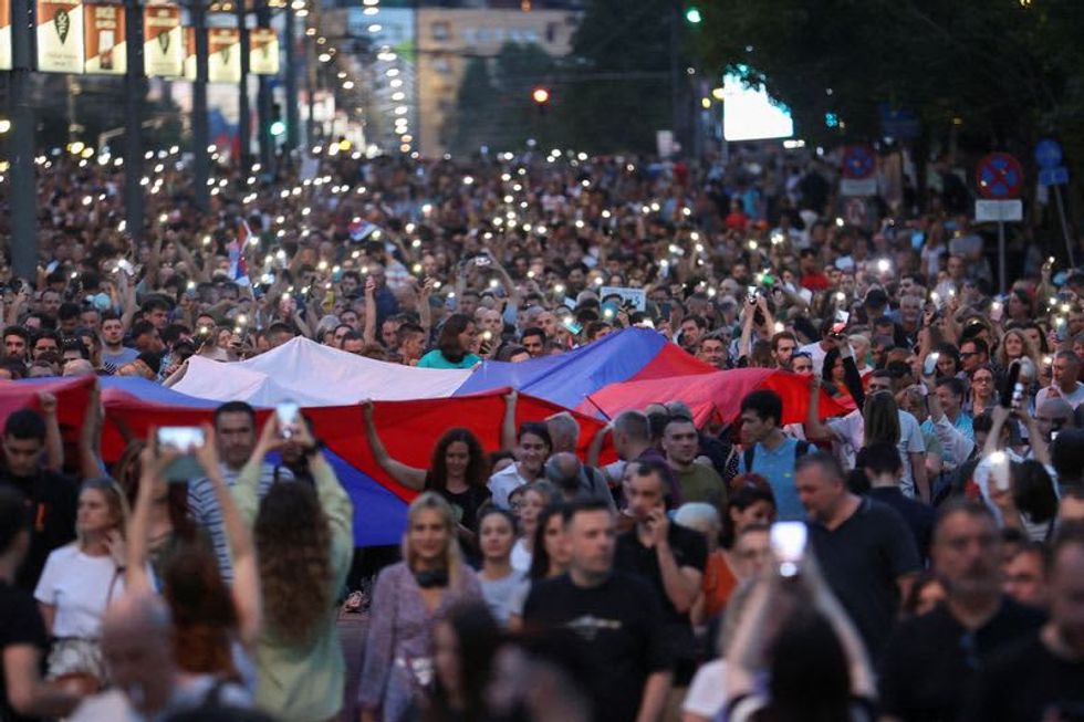 BELGRADE (Reuters) - Tens of thousands of Serbians joined an anti-government protest in Belgrade on Friday for the sixth time since May 3, blaming a culture of violence for the deaths of 18 people in two mass shootings and calling on the interior minister to resign.