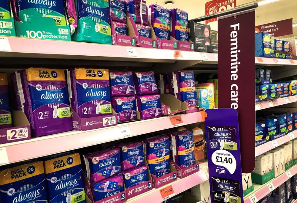 Tampon tax abolition in UK - Sanitary products are seen on shelves at a supermarket. A tax on sanitary products has been abolished in Britain, in a change hailed by the government as a result of Brexit. - Jane Barlow/PA Wire/dpa