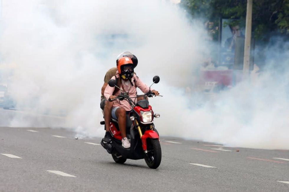 About a hundred police officers in riot gear sealed off a road near Victory Monument in the capital Bangkok with containers and used water cannon, tear gas and rubber bullets to stop a march toward Government House, the office of Prime Minister Prayuth Chan-ocha.
