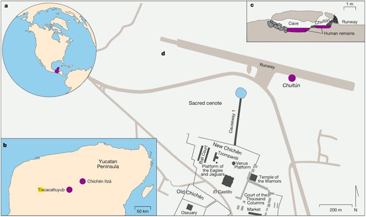 a) Location of the Maya region in the Americas. b) Geographical locations of Chichén Itzá and Tixcacaltuyub in the Yucatan Peninsula. c) Stratigraphy for the chultún and the adjacent cave in which the burial was found. d) Location of the chultún within the archaeological site of Chichén Itzá and its relation to El Castillo. Rodrigo Barquera